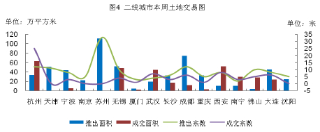 二線城市有12個城市有土地成交,成交量增加。本周二線城市共成交土地72宗,較上周減少8宗,成交面積332萬平方米,較上周增加83萬平方米,環比增加33%。其中,杭州成交25宗,共計63萬平方米,西安成交8宗,共計52萬平方米,為成交量較大的城市。本周有9個二線城市有住宅用地成交,其中西安成交7宗,共計43萬平方米,為住宅用地成交量最大的二線城市。