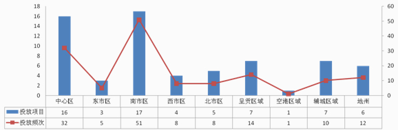 項目投放頻次以東南板塊的螺螄灣國際商貿城投放最強,投放頻次15次,投放版面15版;COCO蜜城投放次之。