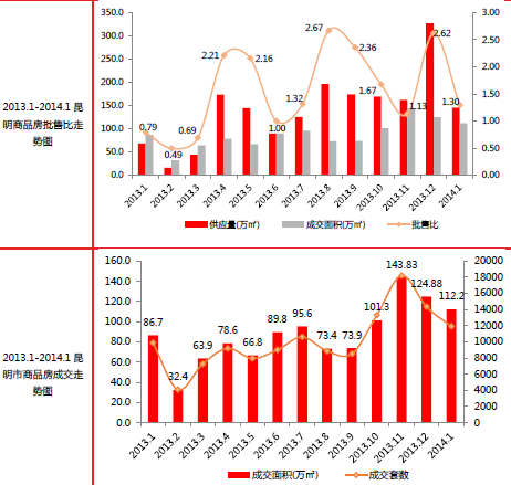 1月,昆明商品房市場新增供應面積145.3萬㎡,環比上漲55.52%;成交面積112.2萬㎡,環比減小10.15%,供求比為1.3。12月份商品房成交仍處高位的主要原因是:由于金盾俊園(政府配套住宅項目)、長水航城(機場集團集配套住宅項目)兩個項目成交結構性下降影響1月份昆明商品房市場成交量小幅回落。未來隨著這兩個項目成交的下降,昆明商品房市場成交將有所回落。