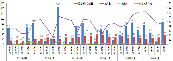 本周市場新增供應87.44萬方,成交面積37.06萬方,批售比為2.36。