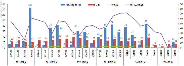 本周市場新增供應21.83萬方,成交面積14.46萬方,批售比為1.51。