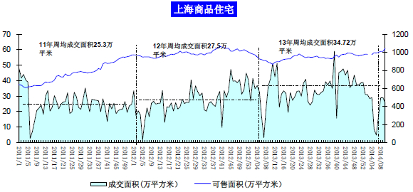 2013年上海首季度成交量漲幅明顯,一路走高。進入二季度出現(xiàn)下降,二季度末持續(xù)上升突破40萬平方米水平。進入三季度成交縮量下滑,后成交持續(xù)上漲,季度末成交量達到交高水平。四季度成交呈現(xiàn)波動下降趨勢。2014年成交持續(xù)小幅下降趨勢,1月末2月初受春節(jié)假期影響成交大跌,第8周成交止跌回升,但本周成交開始下降。