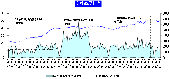 2013年一季度在政策影響下,成交量大幅上漲。進入二季度,成交縮量下滑,5月初受五一小長假影響,跌破10萬平方米水平,后保持小幅回升趨勢。三季度成交先降后升,波動明顯。四季度成交持續上漲,季度末出現正常回落。進入2014年成交持續下滑,之后止跌回升增幅明顯。月末受到春節假期影響成交大幅下降,而后進入止跌回升趨勢。經歷第10周下降后,本周持續上升趨勢。