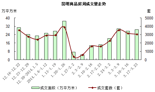 本周(3.17-3.23)昆明商品房成交面積略有上升,共成交28.72萬平方米,環比增長4.72%;成交套數3064套,較上周減少122套,環比下降3.83%;本周昆明商品房套均成交面積為93.94平方米。和年后幾周商品房成交量的逐步回暖情況不同,最近三周商品房成交套數呈下降趨勢,而成交面積有升有降。