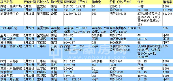 陽春3月,昆明樓市逐漸回暖,據云南房網統計,3月共計有14個項目開盤,推售物業類別包括普通住宅、商鋪、公寓、寫字樓。推售的各類房源據不完全數據統計超過3000套。1月、2月昆明僅有6個項目開盤,僅3月,開盤量已是1、2月的兩倍之多。