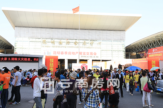 今天(4月12日)是2014年昆明春季房交會的第三天,恰逢周末首日,相比前兩日的氣氛平平,今日各大開發商紛紛使出渾身解數吸引人氣,歌舞升平、幸運抽獎、優惠折扣等活動輪番上演,現場熱鬧程度有增無減,而開發商擺出的陣仗也尤勝前兩日。同時,本次房交會的派單小蜜蜂也是展會最大的主角,他們分布在整個會展中心的各個角落,或呈“夾道歡迎式”,或用“半路攔截法”,偌大的會展中心儼然已經被“小蜜蜂”陣營淹沒,呈現一幅看房客、“小蜜蜂”傻傻分不清楚的局面。和館內的開發商斥資打造精美展位相比,那些沒有進入館內的開發商也像約好似地扎推在館外開展房交會,還派出了成群結隊的“宣傳大使”,更有甚者在展會人流量大的出入口處擺個“地攤”似的展位就開始拉客,大有“館里熱鬧館外笑”的意思。