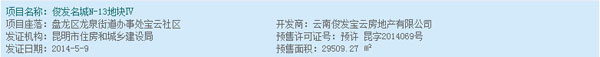 在昆明市房產信息網上,俊發城預許昆字2014069號預售證于5月9日下發,且相關房源價格也對外公布。在公布的俊發名城(俊發城)的新房源及新房源房價目錄中,俊發城N-13地塊5幢號樓建筑面積77-143平米不等的住宅產品獲準售,準售房源最低單價超過9100元,最高單價超10600元且接近10700元。新房源公示價格與俊發城目前在售房源8800元/平米的均價比較來看,俊發城5幢號樓新房源最低單價高于其在售房源均價。
