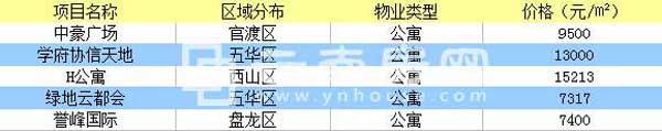 雖然2014年上半年開盤的推售的住宅均價以“8”字出頭,但是公寓的均價仍然過萬。據不完全統計,2104年上半年開盤推售公寓的項目一個5個,包括中豪廣場、學府協信天地H公寓綠地云都會譽峰國際,5個項目的均價為10486元/平米,價格仍然居高不下。不過,從圖表中我們看出,雖然總體的均價過萬,但是也有綠地云都會譽峰國際的均價也是以“7”字打頭陣,購房者較為容易接受。