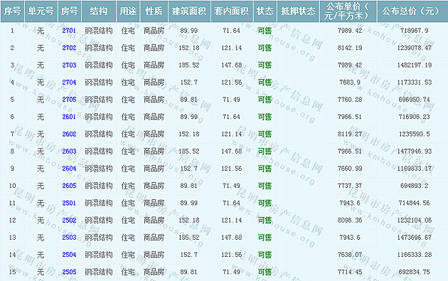 根據云南省物價局關于發布《云南省商品房銷售明碼標價實施細則(試行)》的通知,現將昆鐵家園項目商品住房的準售房源及每套房屋價格向社會公布,房地產開發企業應嚴格按照公布價格,商品房銷售明碼標價實行一套一標。商品房經營者應當對每套商品房按照建筑面具進行明碼標價,否則,房產登記機關不予登記備案。昆鐵家園準售房源及房價信息如下: