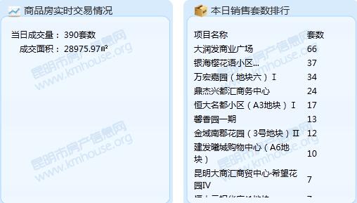 截至1月25日23:33,根據(jù)昆明房產信息網數(shù)據(jù)顯示,2016年1月25日昆明商品房成交套數(shù)為391套,較之昨天的191套,增加了199套;成交面積28975.97㎡。今日排行榜,成交套數(shù)排行前三的項目分別是:大潤發(fā)商業(yè)廣場:66套;銀海櫻花語小區(qū)...:37套;萬宏嘉園(地塊六)Ⅰ:34套。成交面積排行前三的項目分別是:萬宏嘉園(地塊六)Ⅰ:2827.57㎡;大潤發(fā)商業(yè)廣場:2713.26㎡;恒大名都小區(qū)(A3地塊)Ⅰ:2019.66㎡。
