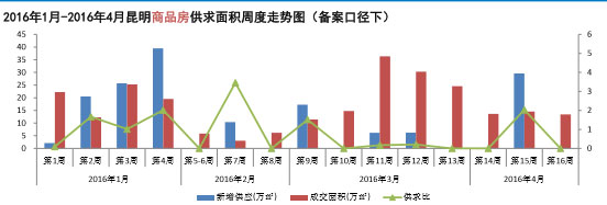 2016年1月-2016年4月昆明商品房供求面積周度走勢圖(備案口徑下)