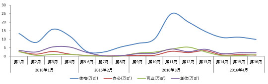 2016年1月-2016年4月昆明商品房各物業成交面積周度走勢圖(備案口徑下)