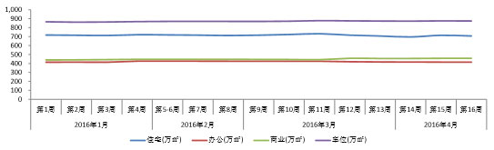 2016年1月-2016年4月昆明商品房各物業存量面積周度走勢圖(備案口徑下)