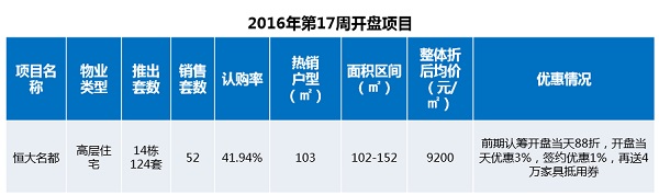 本周1項目開盤,推精裝住宅124套,成交52套,開盤銷售率為41.94%。