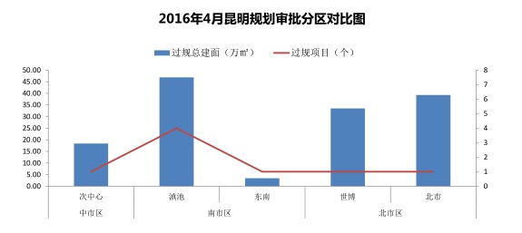 2016年4月,次中心板塊過(guò)規(guī)建面為18.37萬(wàn)方,占比12.98%;滇池板塊過(guò)規(guī)建面為46.87萬(wàn)方,占比33.12%;東南板塊區(qū)過(guò)規(guī)建面3.45萬(wàn)方,占比2.4%;世博板塊過(guò)規(guī)建面為33.52萬(wàn)方,占比23.68%;北市板塊過(guò)規(guī)建面39.30萬(wàn)方,占比27.77%。其他板塊無(wú)規(guī)劃放量。2016年4月,東市區(qū)、呈貢區(qū)、西市區(qū)和空港新區(qū)無(wú)項(xiàng)目過(guò)規(guī)。