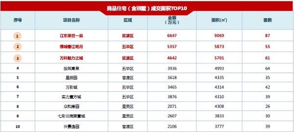點評:本周江東圣世一品、綠城春江明月、萬科魅力之城分別獲得成交面積榜前三,入榜項目以剛需型項目為主;呈貢區有兩個項目進入榜單前十:眾和康園、七彩云南第壹城。