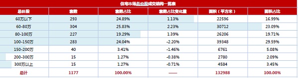 本周成交主力集中在60萬以下、60-80萬、100-150萬三個總價段,套數分別占比24.89%、25.83%及24.04%;本周各總價段產品成交環比起伏不大,市場總體較為平穩。