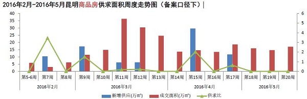 2016年2月-2016年5月昆明商品房供求面積周度走勢圖(備案口徑下)