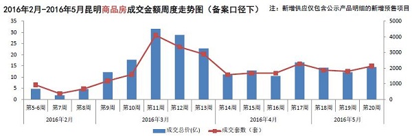 2016年2月-2016年5月昆明商品房成交金額周度走勢圖(備案口徑下)