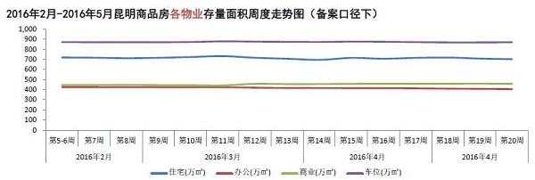 2016年2月-2016年5月昆明商品房各物業存量面積周度走勢圖(備案口徑下)