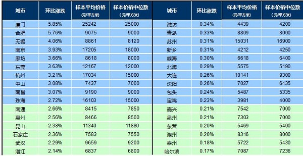 2016年5月,住宅價格環比2016年4月上漲的城市個數為74個,較上月增加3個。漲幅居前十位的城市依次是:廈門、合肥、無錫、南京、廊坊、東莞、杭州、中山、南昌、珠海。具體來看,廈門、合肥漲幅超過5%,無錫上漲4.06%緊隨其后,南京、廊坊、東莞、杭州、中山、南昌漲幅在3%-4%之間,珠海上漲2.72%。其他環比上漲的64個城市中,南通、惠州等9個城市漲幅在2.0%-2.7%之間;株洲、上海等10個城市漲幅在1%-2%之間;西寧、常州等11個城市漲幅在0.5%-1.0%之間,西安、濟南等34個城市漲幅在0.5%以內。鄂爾多斯、營口房價與上月持平。