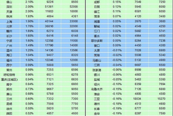 2016年5月,住宅價格同比2015年5月上漲的城市個數為54個,較上月增加4個。其中,深圳上漲58.82%,居首位,漲幅收窄1.06個百分點;惠州、東莞漲幅超過30%,緊隨其后;蘇州、南京等9個城市漲幅在20%-30%之間;武漢、廈門等5個城市漲幅在10%-20%之間;溫州、佛山等12個城市漲幅在5%-10%之間;嘉興、柳州等25個城市漲幅在5%以內。連云港房價同比持平。