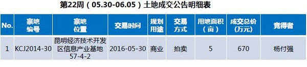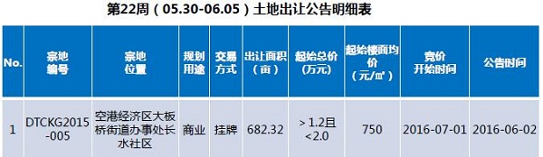 本周成交土地1宗,成交面積為5畝,為商業用地。