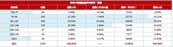 本周成交主力依然集中在70-90㎡、90-120㎡兩個(gè)面積段,分別占全周成交套數(shù)的22.28%和39.33%,但70-90㎡成交環(huán)比下降7.46%;90-180㎡產(chǎn)品成交有小幅度上漲,總體來看市場波動不大。