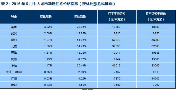 根據百城價格指數對北京、上海等十大城市(新建)住宅的全樣本調查數據顯示,2016年6月十大城市住宅均價為22450元/平方米,環比上漲1.52%,漲幅較上月收窄0.41個百分點。十大城市仍全部上漲,其中南京上漲3.82%,仍居十城首位,漲幅較上月收窄0.11個百分點;武漢上漲2.60%,緊隨其后;其他城市漲幅在2%以內,成都漲幅仍最小,為0.13%。