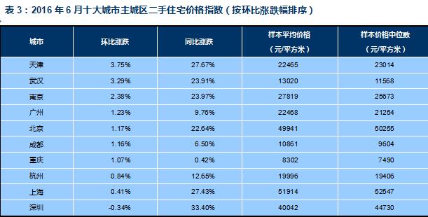 根據對北京等十大城市主城區二手住宅的活躍樣本調查,2016年6月,十大城市主城區二手住宅樣本平均價格為33695元/平方米,環比上漲0.98%,同比上漲22.70%.