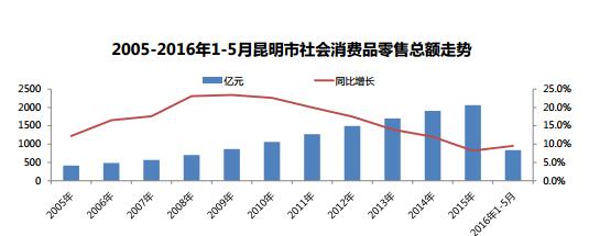 2016年1-5月,昆明市社會消費品零售總額837.14億元,同比增長9.5%。昆明市消費品走勢同比增長仍2015年跌至8.2%,今年有所回升,在消費引領的推動下一定程度拉勱經濟上行。