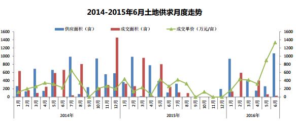 2016年6月,供應土地15宗,面積為1068.46畝,環比增長305.92%,同比增長857.74%;成交土地1宗,面積為31.62畝,環比下降52.99%,同比下降87.49 %。本月成交土地1宗,成交金額4.21億元。