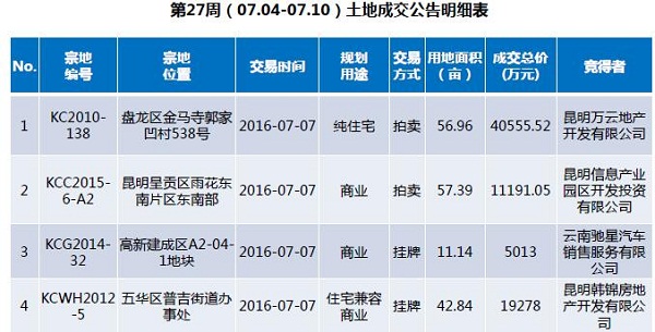 本周成交土地4宗,成交面積為168.33畝,為純住宅、商業(yè)和住宅兼商業(yè)用地。