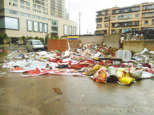 幾位小區業主介紹,這些建筑垃圾堆放已經有些日子了。垃圾房一直是鑫都韻城物業負責管理,但物業說只負責生活垃圾清理。這些建筑垃圾不清楚是怎么來的,這兩天時而下雨時而大太陽,垃圾房前面的稀泥里散發出濃烈的臭味。