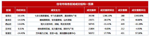 本周全市商品住宅成交整體上漲,呈貢區(qū)由于數(shù)據(jù)恢復(fù),成交面積漲幅達(dá)1286.10%,套數(shù)漲幅達(dá)1340.00%;盤龍區(qū)和官渡區(qū)分別上漲28.57%、 17.79%;西山區(qū)下降31.41%。本周全市各區(qū)商品住宅成交呈貢區(qū)和西山區(qū)分別上漲10.16%、 13.63%,盤龍區(qū)下跌14.53%,官渡區(qū)跌幅達(dá)24.45%。