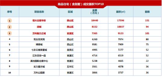 點評:本周恒大云報華府獲得成交面積榜冠軍,潤城、萬科魅力之城分列第二、三名;剔除團(tuán)購后,呈貢區(qū)僅七彩云南第壹城上榜。