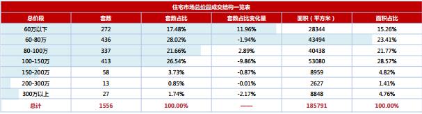 本周全市商品房成交主要集中于60-80萬、 80-100萬、 100-150萬三個總價段,分別占總套數(shù)的28.02%、 21.66%及26.54%;由于呈貢區(qū)數(shù)據(jù)恢復(fù),60萬以下總價段成交出現(xiàn)明顯上漲。