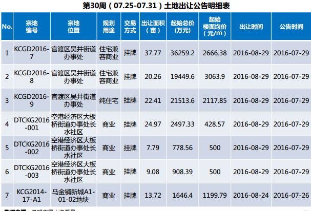 本周供應土地7宗,面積136畝,為住宅兼商業、純住宅和商業用地。本周無土地成交。