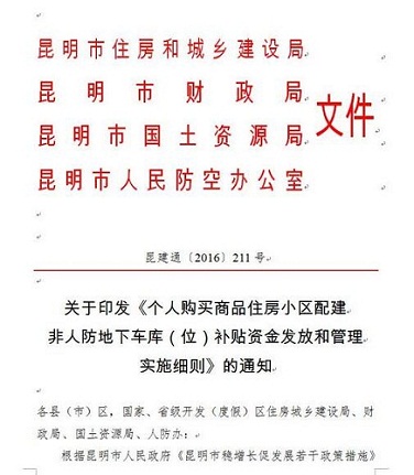 今日(8月10日),昆明市住建局發(fā)布了《個人購買商品住房小區(qū)配建非人防地下車庫(位)補貼資金發(fā)放和管理實施細則》(以下簡稱“細則”),細則內(nèi)容顯示:凡2016年3月1日起至2017年3月1日止,凡購買昆明市(縣)行政轄區(qū)范圍內(nèi)開發(fā)公司出售的商品房住宅小區(qū)配建的非人防地下車庫(位)的,辦理相關(guān)產(chǎn)權(quán)證后按證載建筑面積給予每平米160元的補貼,補貼面積最高不超過30平米(含30平米)。政策原文如下: