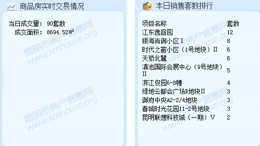 截至8月14日22:50,昆明市房產信息網成交數據顯示,2016年8月14日昆明成交商品房套數為90套。較之昨天的149套,減少了59套;成交面積8694.52平米。今日成交套數排行前三的項目分別是:圣世一品(江東逸庭園):12套;銀海尚御小區:8套;時代之窗小區:6套。成交面積排行前三的項目分別是:江東逸庭園,成交面積:1519.11㎡;時代之窗小區,成交面積:756.161㎡;滇池國際會展中心,成交面積:583.94㎡。