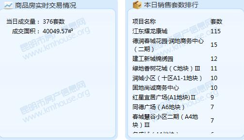 截至8月15日22:40,昆明市房產信息網成交數據顯示,2016年8月15日昆明成交商品房套數為376套。較之昨天的90套,增加了286套;成交面積40049.57平米。今日成交套數排行前三的項目分別是:江東耀龍康城:115套;德潤春城花園·潤地商務中心(二期):15套;建工新城錦繡園:12套。成交面積排行前三的項目分別是:同德廣場(A6地塊),成交面積:14557.7㎡;江東耀龍康城,成交面積:2923.91㎡;潤城小區(十區A1-1地塊),成交面積:1138.75㎡。
