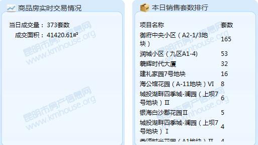 截至8月27日22:53,昆明市房產(chǎn)信息網(wǎng)成交數(shù)據(jù)顯示,2016年8月27日昆明成交商品房套數(shù)為373套。較之昨天的254套,增加了119套;成交面積41420.61平米。今日成交套數(shù)排行前三的項目分別是:御府中央小區(qū)(A2-1/3地塊):165套;潤城小區(qū)(九區(qū)A1-4):53套;羲輝時代大廈:32套。成交面積排行前三的項目分別是:御府中央小區(qū)(A2-1/3地塊),成交面積:21142.5㎡;潤城小區(qū)(九區(qū)A1-4),成交面積:6039.32㎡;羲輝時代大廈,成交面積:1597.04㎡。