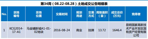本周成交土地1宗,成交面積為13.72畝,為商業用地