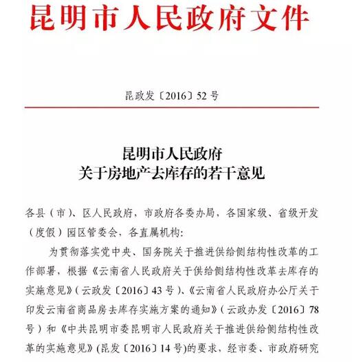 近日,昆明市人民政府發布了關于房地產去庫存的若干意見,這是繼2015年12月《昆明市人民政府關于促進房地產市場平穩健康發展的若干意見》,和今年2月的《昆明市人民政府關于印發昆明市穩增長促發展若干政策措施的通知》之后,昆明市又一去庫存促行業發展的新政,雖然政策中鼓勵以購代建、貨幣化安置,稅收優惠,大力發展租賃市場等都屬于重復提及,但在具體政策上有更進一步放寬,如已建成商業項目也可改為教育醫療等新興產業、明確貨幣化安置最高獎勵補償標準20%、開發商未售出房源均可改為租賃等措施則是首次提出,《意見》的施行期為一年,意味著很多新政的施行期限也得到了延長。具體政策原文公布如下: