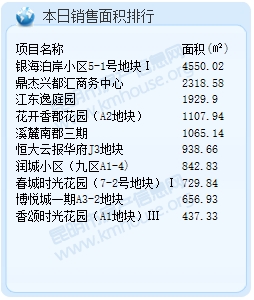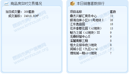 截至9月14日23:23,昆明市房產信息網成交數據顯示,2016年9月14日昆明成交商品房套數為309套。較之昨天的399套,減少了90套;成交面積24918.82平米。今日成交套數排行前三的項目分別是:鼎杰興都匯商務中心:72套;銀海泊岸小區5-1號地塊I:38套;江東逸庭園:18套。成交面積排行前三的項目分別是:銀海泊岸小區5-1號地塊I,成交面積:4550.02㎡;鼎杰興都匯商務中心,成交面積:2318.58㎡;江東逸庭園,成交面積1929.9㎡。