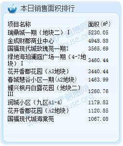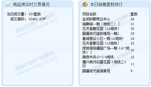 截至10月9日23:07,昆明市房產信息網成交數據顯示,2016年10月9日昆明成交商品房套數為523套。較之昨天的361套,增加了162套;成交面積52463.47平米。今日成交套數排行前三的項目分別是:金成財郡商業中心:54套;瑞鼎城一期(地塊二)I:51套;花開香郡花園(A3地塊):36套。成交面積排行前三的項目分別是:瑞鼎城一期(地塊二)I,成交面積:5230.05㎡;金成財郡商業中心,成交面積:4948.88㎡;國福現代城玫瑰苑一期I,成交面積:3565.69㎡。