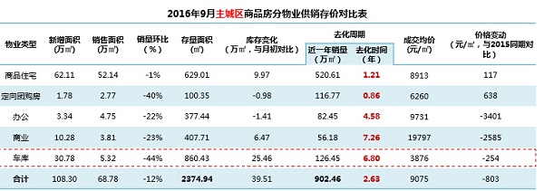 本月主城區(qū)商品房各物業(yè)銷量環(huán)比均下降。定向團購房和商品住宅均價較2015年同期上漲,其他物業(yè)類型均下滑,其中辦公和商業(yè)降幅較大。定向團購房和商品住宅去化時間較短,分別為0.86年和1.21年;辦公、商業(yè)和車庫庫存較高,其中商業(yè)去化周期較長。