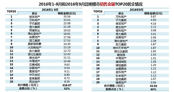 【房企排名】9月TOP20房企銷售金額45.9億,占比68%;品牌開發(fā)商已占領(lǐng)昆明市場
