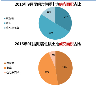 【土地性質(zhì)】昆明商業(yè)類土地供應(yīng)占50%;成交10宗土地,純住宅及商業(yè)用地所占比例相近