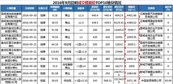【成交樓面價排行】9月云南馳泰斬獲一宗商業(yè)地塊,樓面價均為4401元/㎡
